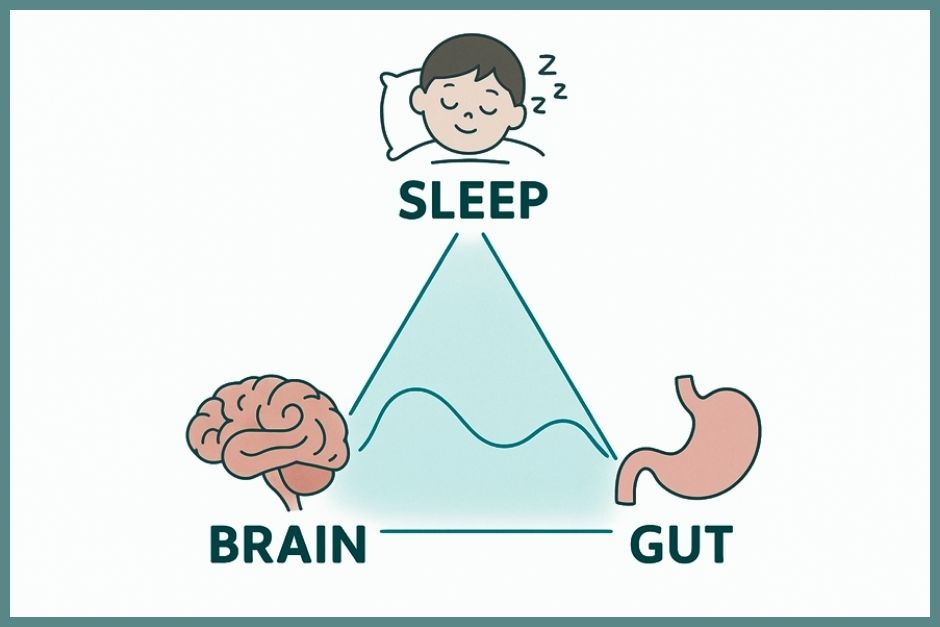 Think of sleep, the brain, and the gut as three points of a triangle. If one side is disrupted, the others wobble too: